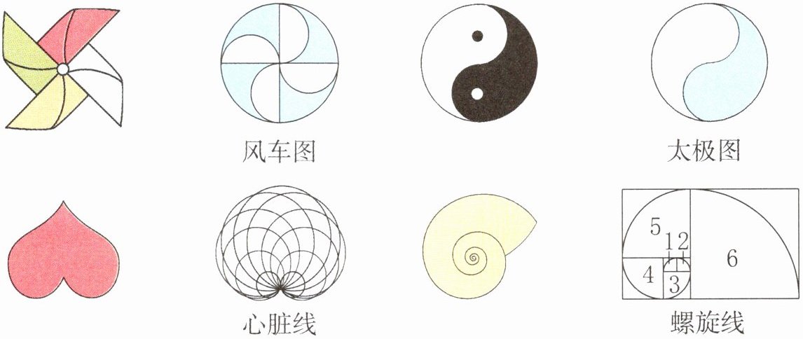 )个半径不等的$\frac {1}{4}$圆(图中的 3、4、5、6)组成的。2.绘制风车图和太极图。