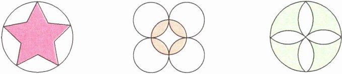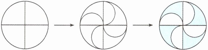 ①画出一个圆及它的 2 条互相垂直的直径;②分别以它的 4 条半径为新的直径画出 4 个半圆;③涂色。