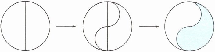 个圆及它的一条竖直的直径;②在这条直径两侧,分别以它的一半(即圆的半径)为新的直径画 2 个半圆;③擦掉直径,涂色。