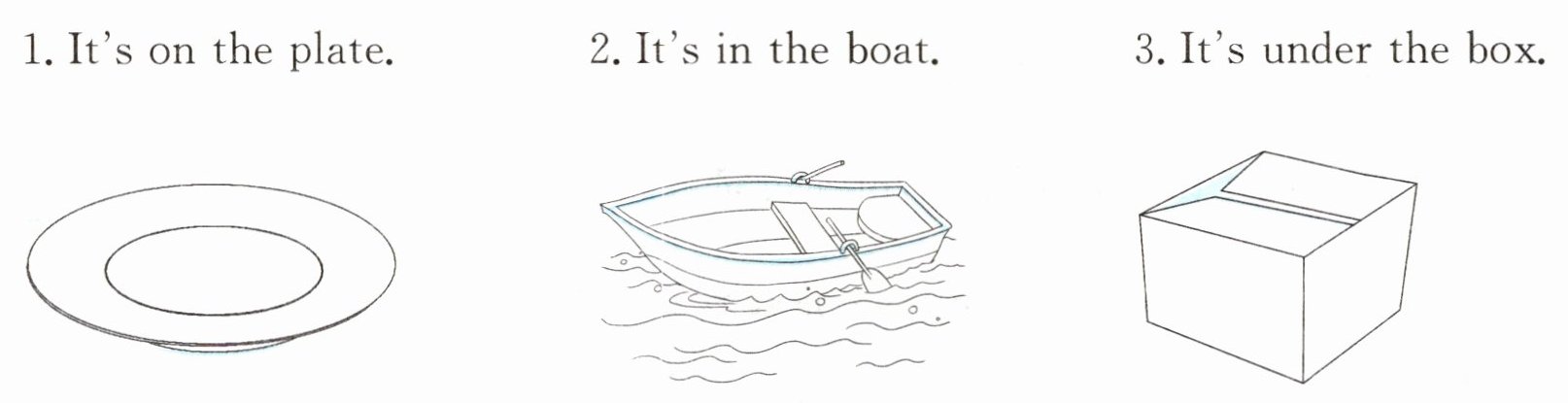 3. “It's under the box.” 表示苹果在盒子下面,在盒子的正下方画苹果。