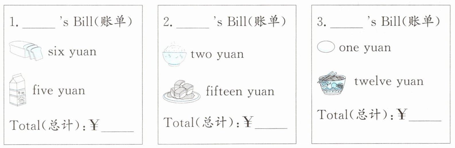 三、阅读对话,帮粗心的服务员找到账单的主人,并结算账单。