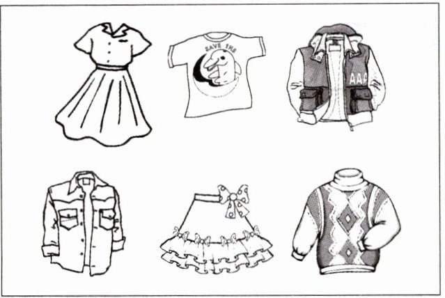 1. I like the blue T - shirt. 2. Where is my sweater? 3. What colour is your sweater? 4. Is this your jacket? 5. Whose shirt is this? 6. My skirt is gray. 7. This is Lucy's dress. 8. I like the white sweater with the green skirt.
