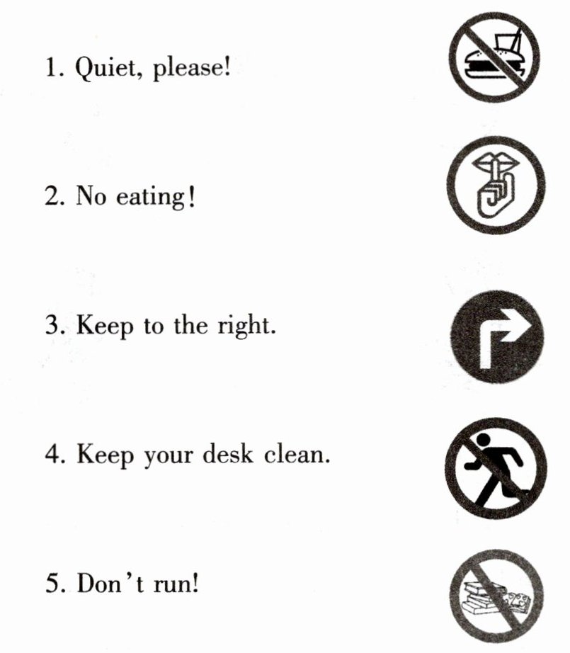 1. What’s your name? 2. I can show you the English books. 3. Can I read the books here? 4. Work quietly, please!
