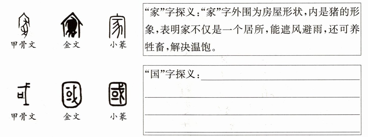 (1)“国”字外面是围墙的形状,里面是兵器、土地的形象,表明国家不仅是一块封地,更是我们拿起武器要守卫的家园。
