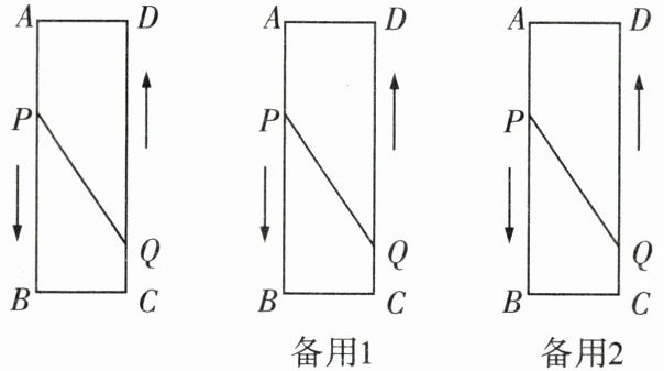 13. 如图,在矩形$ABCD$中,$AB=6\mathrm{cm}$,$AD=2\mathrm{cm}$,动点$P$,$Q$分别从点$A$,$C$同时出发,点$P$以$2\mathrm{cm}/\mathrm{s}$的速度向终点$B$移动,点$Q$以$1\mathrm{cm}/\mathrm{s}$的速度向点$D$移动,当有一动点到达终点时,另一动点也停止运动.设运动的时间为$t\mathrm{s}$,问: