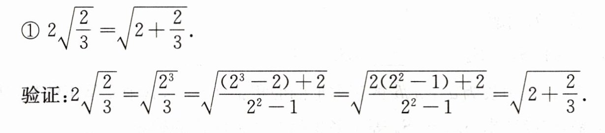 验证:$2 \sqrt { \frac { 2 } { 3 } } = \sqrt { \frac { 2 ^ { 3 } } { 3 } } = \sqrt { \frac { ( 2 ^ { 3 } - 2 ) + 2 } { 2 ^ { 2 } - 1 } } = \sqrt { \frac { 2 ( 2 ^ { 2 } - 1 ) + 2 } { 2 ^ { 2 } - 1 } } = \sqrt { 2 + \frac { 2 } { 3 } }$.