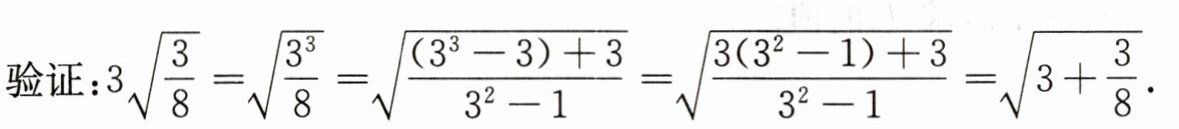 验证:$3 \sqrt { \frac { 3 } { 8 } } = \sqrt { \frac { 3 ^ { 3 } } { 8 } } = \sqrt { \frac { ( 3 ^ { 3 } - 3 ) + 3 } { 3 ^ { 2 } - 1 } } = \sqrt { \frac { 3 ( 3 ^ { 2 } - 1 ) + 3 } { 3 ^ { 2 } - 1 } } = \sqrt { 3 + \frac { 3 } { 8 } }$.