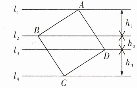 6. 如下左图,正方形纸片ABCD的四个顶点分别在四条平行线$l_{1},l_{2},l_{4},l_{3}$上,这四条直线中,相邻两条之间的距离依次为$h_{1},h_{2},h_{3}(h_{1}>0,h_{2}>0,h_{3}>0)$,若$h_{1}=5,h_{2}=2$,则正方形ABCD的面积$S=$______.