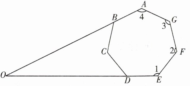 9. 如上右图,在七边形$ABCDEFG$中,$AB$,$ED$的延长线交于点$O$,$∠1$,$∠2$,$∠3$,$∠4$的外角度数和为$220^{\circ }$,则$∠BOD=$____$^{\circ }$.