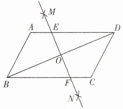 2. 如上右图,在平行四边形 $ABCD$ 中,分别以点 $B$,$D$ 为圆心,大于 $\frac{1}{2}BD$ 的长为半径画弧,两弧相交于点 $M$,$N$,过 $M$,$N$ 两点作直线交 $BD$ 于点 $O$,分别交 $AD$,$BC$ 于点 $E$,$F$,下列结论不正确的是( )。