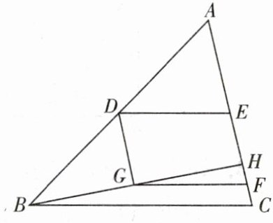 10. 如图,在 $\triangle ABC$ 中,点 $D$,$E$ 分别为 $AB$,$AC$ 的中点,点 $H$ 在线段 $CE$ 上,连接 $BH$,点 $G$,$F$ 分别为 $BH$,$CH$ 的中点。