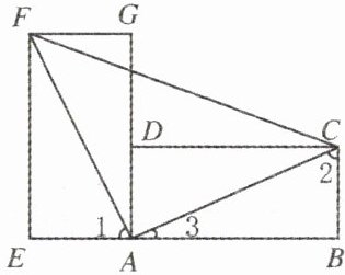 $ \because $ 矩形 $ ABCD $ 与矩形 $ AGFE $ 的形状和大小完全一样, $ \therefore AE = BC $, $ EF = AB $, $ \angle E = \angle B = 90^\circ $, $ \therefore \triangle AEF \cong \triangle CBA $, $ \therefore AF = CA $, $ \angle 1 = \angle 2 $. $ \because \angle B = 90^\circ $, $ \therefore \angle 2 + \angle 3 = 90^\circ $, $ \therefore \angle 1 + \angle 3 = 90^\circ $, $ \therefore \angle FAC = 90^\circ $, $ \triangle AFC $ 是等腰直角三角形.