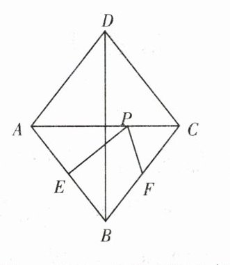 4. 如上右图,在菱形 $ABCD$ 中,对角线 $AC = 6$,$BD = 8$,点 $E$,$F$ 分别是边 $AB$,$BC$ 的中点,点 $P$ 在 $AC$ 上运动,在运动过程中,$PE + PF$ 的最小值是( )。