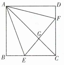 5. 如图,在正方形 $ABCD$ 中,点 $E$,$F$ 分别在 $BC$,$CD$ 上,$\triangle AEF$ 是等边三角形,连接 $AC$ 交 $EF$ 于点 $G$,下列结论:① $BE = DF$;② $\angle DAF = 15^{\circ}$;③ $AC$ 垂直平分 $EF$;④ $BE + DF = EF$;⑤ $S_{\triangle CEF} = 2S_{\triangle ABE}$。其中正确的有( )。