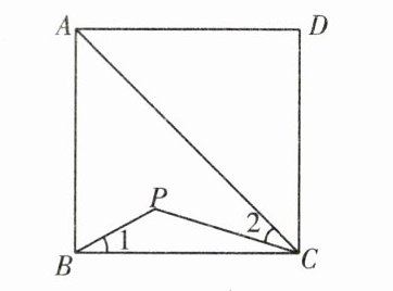 7. 如下左图,点 $P$ 是正方形 $ABCD$ 内位于对角线 $AC$ 下方的一点,$\angle 1 = \angle 2$,则 $\angle BPC$ 的度数为 $^{\circ}$。