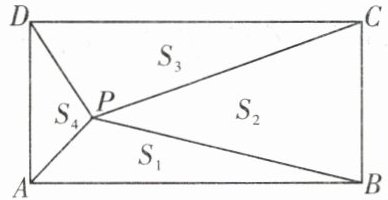 4. 如下左图,$P$ 是矩形 $ABCD$ 内的任意一点,连接 $PA$,$PB$,$PC$,$PD$,得到 $\triangle PAB$,$\triangle PBC$,$\triangle PCD$,$\triangle PDA$,设它们的面积分别为 $S_1$,$S_2$,$S_3$,$S_4$,给出如下结论:① $S_1 + S_2 = S_3 + S_4$;② $S_2 + S_4 = S_1 + S_3$;③ 若 $S_3 = 2S_1$,则 $S_4 = 2S_2$;④ $S_1$,$S_2$,$S_3$,$S_4$ 不可能全相等。其中正确的有( )。
