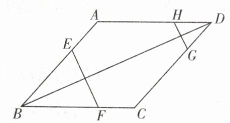 2. 如上右图,在菱形 $ABCD$ 中,点 $E$,$F$,$G$,$H$ 分别是 $AB$,$BC$,$CD$,$AD$ 上的点,且 $BE = BF = CG = AH$。若菱形的面积等于 $24$,$BD = 8$,则 $EF + GH=$( )。