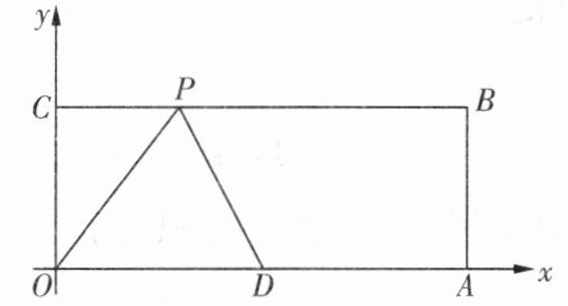 7. 如上右图,在平面直角坐标系中,矩形 $OABC$ 的顶点 $A$,$C$ 的坐标分别为 $(10,0)$,$(0,4)$,点 $D$ 是 $OA$ 的中点,点 $P$ 在 $BC$ 上运动,当 $\triangle ODP$ 是腰长为 $5$ 的等腰三角形时,点 $P$ 的坐标为______。