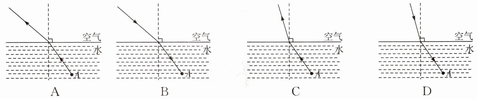8.在小河旁往往会有“水深危险”的标识牌,为了我们的人身安全,严禁私自下河游泳。能正确描述岸上的人看到水底A点的光路图是 ( )