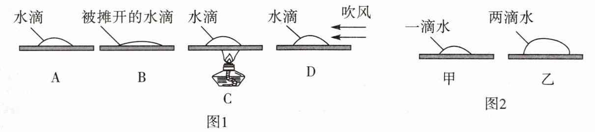 9.小新暑假去旅游,曾到海边看到人们用“海水晒盐”,即选取大片的海滩,构建盐田,一段时间后,盐田中的水逐渐变少,粗盐也就出来了。小新想,水如果能快点变少,粗盐也就能出得更快。可是水变少的快慢跟哪些因素有关呢?小新同学在4块相同的玻璃板上各滴一滴质量相同的水,进行如图1所示的实验探究,得出水蒸发快慢与水的温度、水的表面积和水面上方空气流动快慢有关。