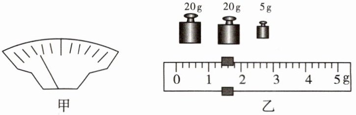 6. 现用托盘天平称量一物体的质量。把天平放在水平台面上,取下两侧的橡胶垫圈,指针就开始摆动。稳定后,指针指在分度盘的位置如图甲所示。