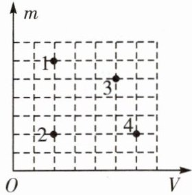 2. 在测量物质的密度时,小明测出了四种固体的质量与体积,并将它们标在如图所示的坐标系中。根据图中信息可知,$\rho_{1}$____$\rho_{4}$,$\rho_{2}$____$\rho_{3}$。(均选填“>”“=”或“<”)