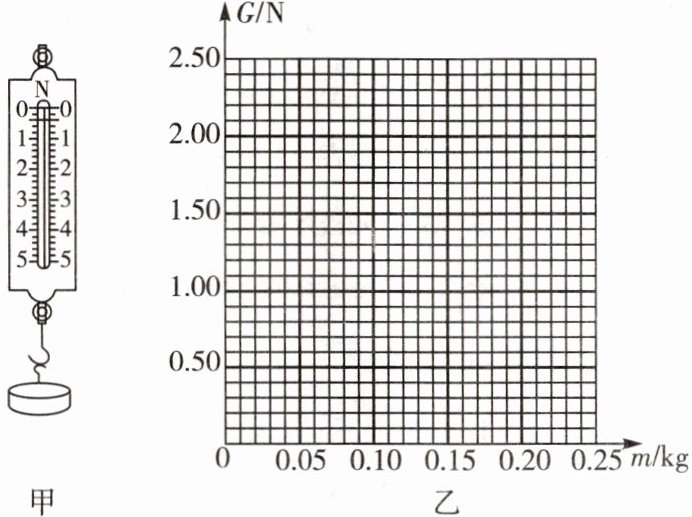 9. 在探究“重力与质量的关系”实验中,采用的实验装置如图甲所示。实验中,以钩码作为被测物体,每个钩码的质量$ m $均为$ 50g $。实验步骤如下: