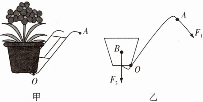 10.如图甲所示为硕硕家的一个搬花神器,用它抬起花盆时相当于一个绕O点转动的杠杆,其简化示意图如图乙所示。搬花神器自身的质量为7kg,O点到神器自身重力作用线的距离为55cm。使用时,在把手A处施加力$F_{1}$,已知O点到力$F_{1}$作用线的距离为110cm,g取10N/kg。