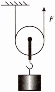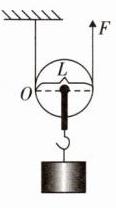 4.如图所示,利用动滑轮来提升一个物体,拉力$F$竖直向上。动滑轮可以看成一种杠杆,请在图中标出它的支点$O$,并画出$F$的力臂$L$。
