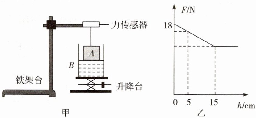 10. 某物理实验小组用如图甲所示的装置进行应用浮力测密度的相关实验。力传感器固定在铁架台上,其示数显示细线拉力的大小。底面积为$40cm^{2}$的实心均匀圆柱体A通过轻质细线与力传感器相连。柱形容器B放在水平升降台上,容器内装有20cm深的水。开始时A与水面刚好接触,然后升高升降台使A逐渐浸入水中(细线不可伸缩),此过程中力传感器的示数F与A浸在水中的深度h的关系如图乙所示。A不吸水且始终保持竖直,整个过程无水溢出。($ρ_{水}=1×10^{3}kg/m^{3},g=10N/kg$)求: