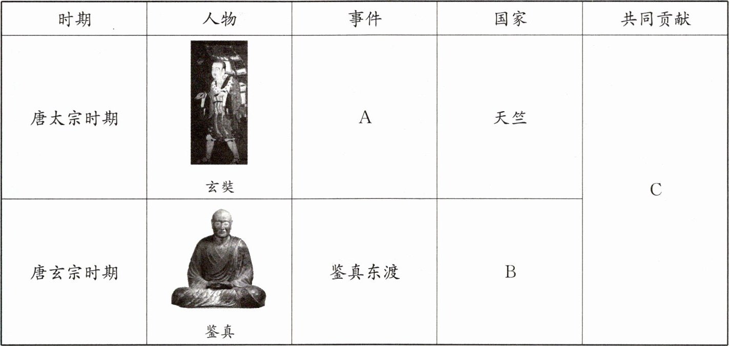 (1)A:玄奘西行;B:日本;C:都为佛教的传播作出了贡献,促进了中外文化交流。