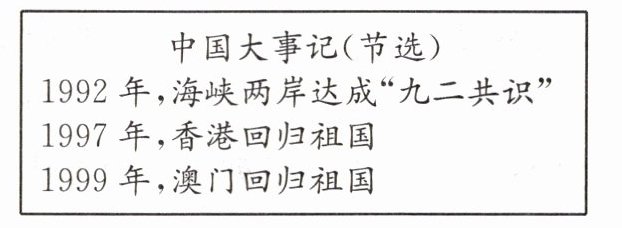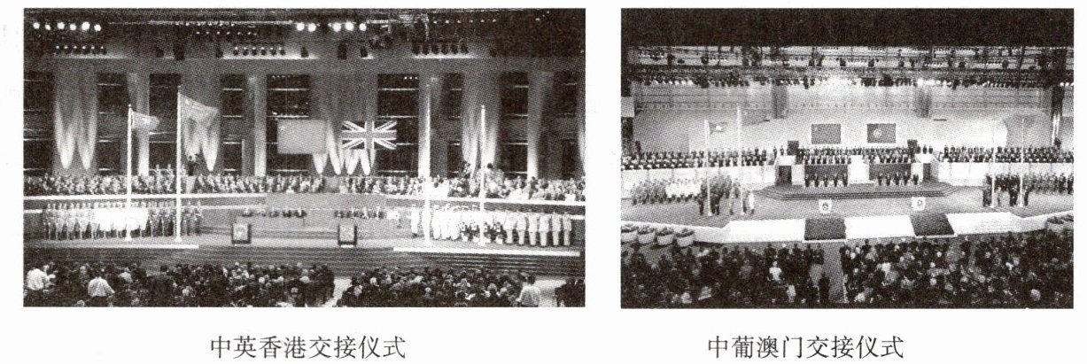 (2)“一国两制”。意义:香港、澳门回归祖国,标志着中国人民洗雪了百年国耻,在完成祖国统一大业的道路上迈出了重要一步。