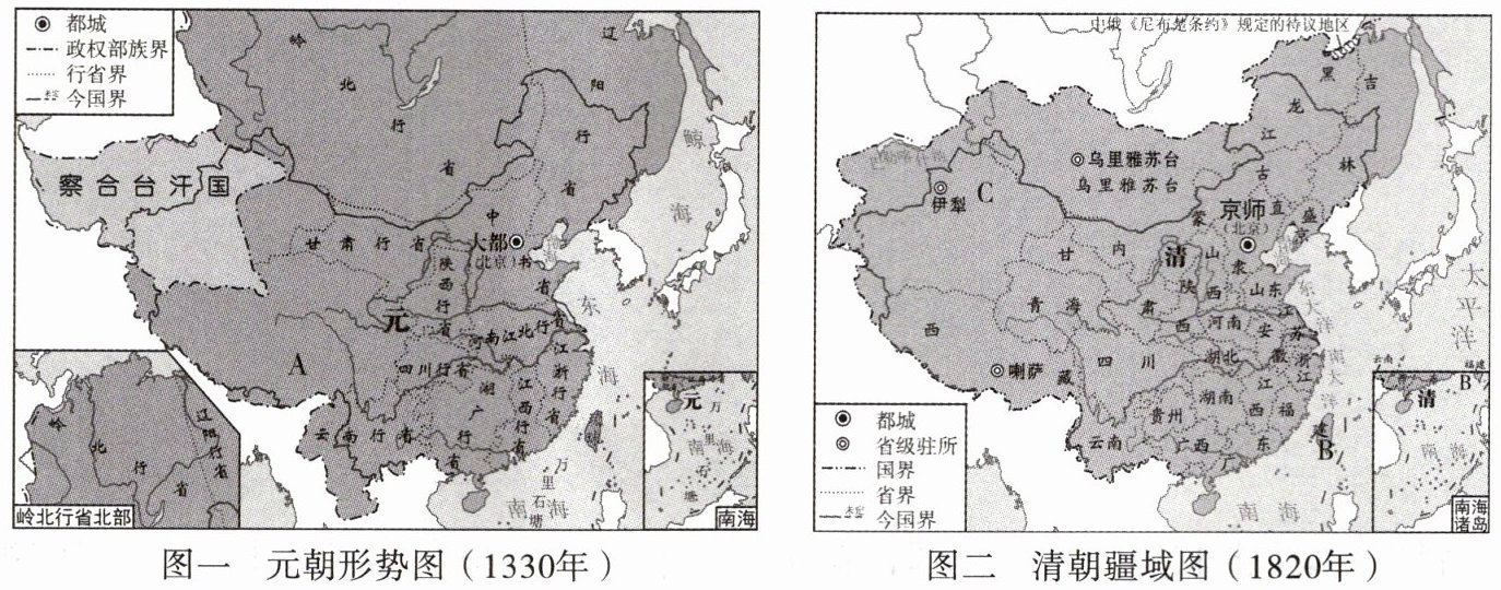 清朝为加强对边疆地区的管辖,在图二B、C两处分别设置了什么机构?B:台湾府(1885年,清政府设立台湾省)