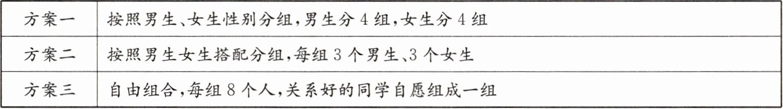 2025年3月12日,某学校开展义务植树活动。某班主任将全班同学分成若干小组开展植树活动,同学们推荐了以下几种分组方案。
