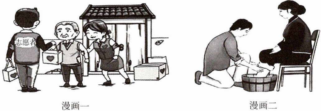 (1)漫画一:扶危济困。漫画二:孝老爱亲。