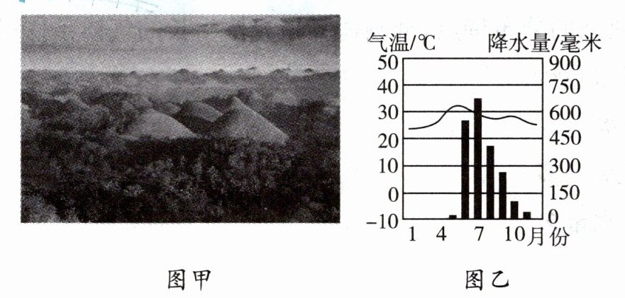 材料一 菲律宾薄荷岛的草在雨季时为绿色,旱季则被炎热的太阳晒干变成咖啡色,酷似巧克力,因此得名“巧克力山”。图甲为薄荷岛景观图,图乙为薄荷岛气温曲线和降水量柱状图。