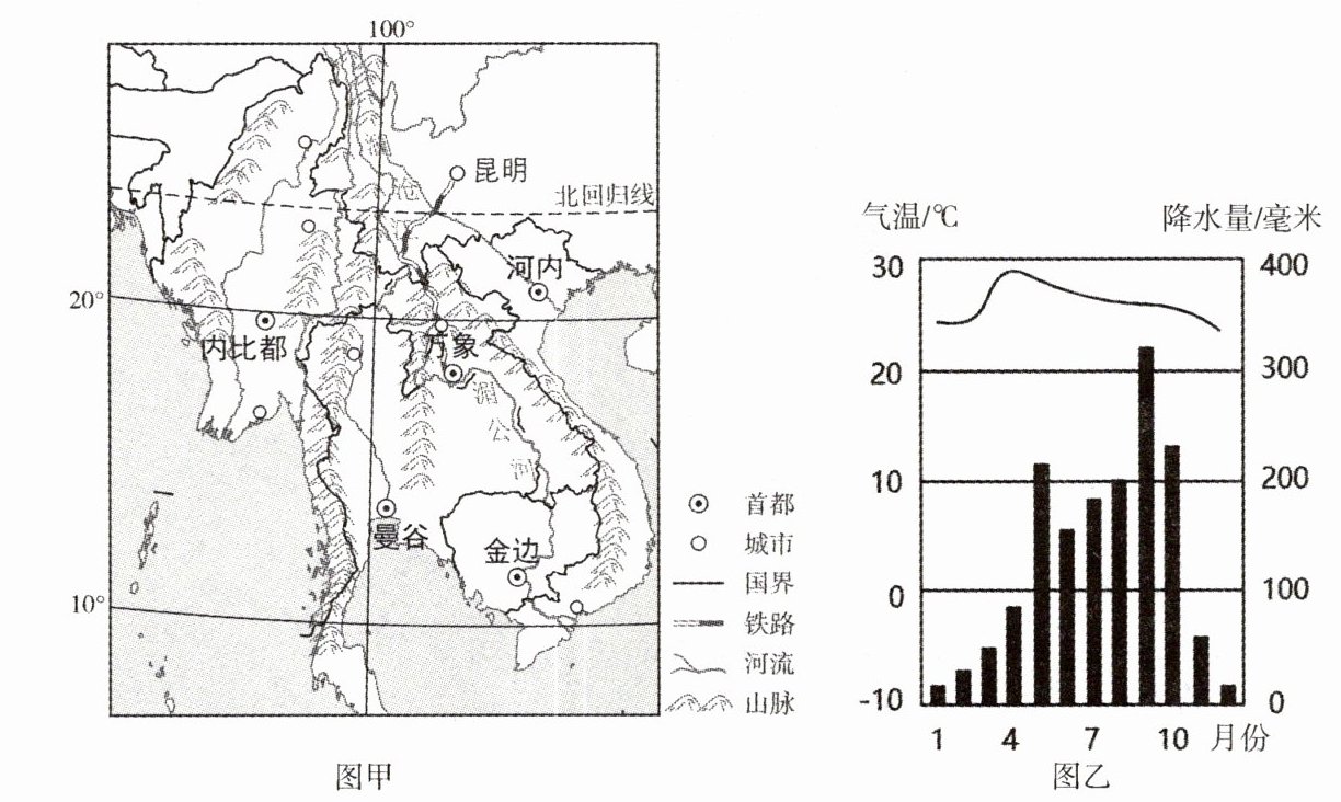 1.结合中老铁路示意图(图甲)、A地气温曲线与降水量柱状图(图乙)和相关材料,回答下列问题。