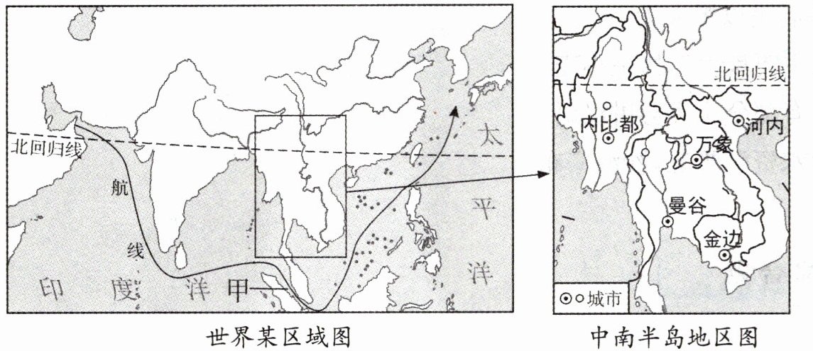 2.读世界某区域图和中南半岛地区图,回答下列问题。