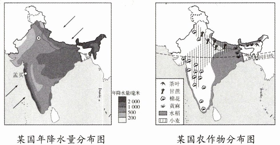 1.受益于人口红利,某国可能成为除中国以外,世界市场新的供应基地。读某国年降水量分布图与农作物分布图,回答下列问题。