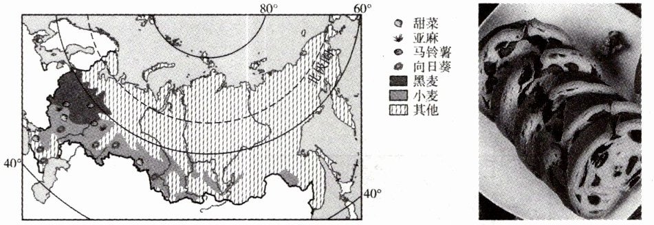 俄罗斯人喜欢吃大列巴,这种面包非常干硬,它能在较恶劣的气候条件下长期保存。读俄罗斯农业分布图和大列巴图片,完成2、3题。
