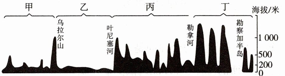 5. 读俄罗斯沿60°N纬线地形剖面图,甲、乙、丙、丁代表不同的地形区,下列叙述正确的是(