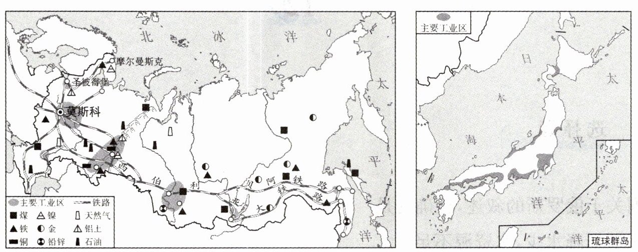 2. 俄罗斯与日本是隔海相望的两个国家,人口均超过1亿。读图并结合所学知识,完成下列要求。