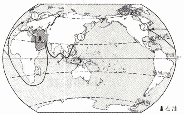 2. 该石油输出线路终点所到达的地区和国家①②③分别是(