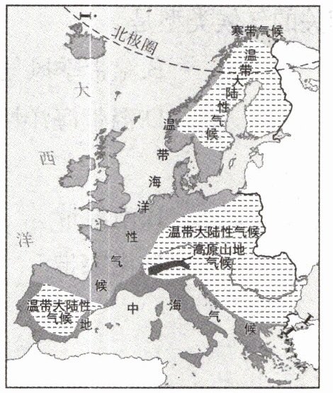 油橄榄主要种植在地中海沿岸地区,是典型的亚热带常绿硬叶树种,具有独特的习性,树叶呈尖细状,叶片向阳的一面具有蜡质层。读欧洲西部气候类型分布图,完成1、2题。