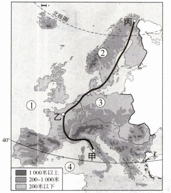(2)7月初,张明同学与父母去欧洲旅游,行程为图中的甲→乙→丙。他们首先来到甲国(意大利),该地气候类型为