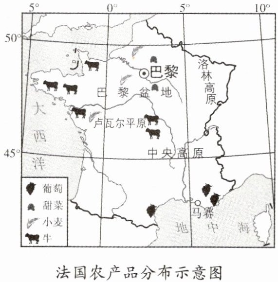 法国是欧洲西部最大的粮食生产国和世界最大的葡萄酒产地。读法国农产品分布示意图,回答3~5题。