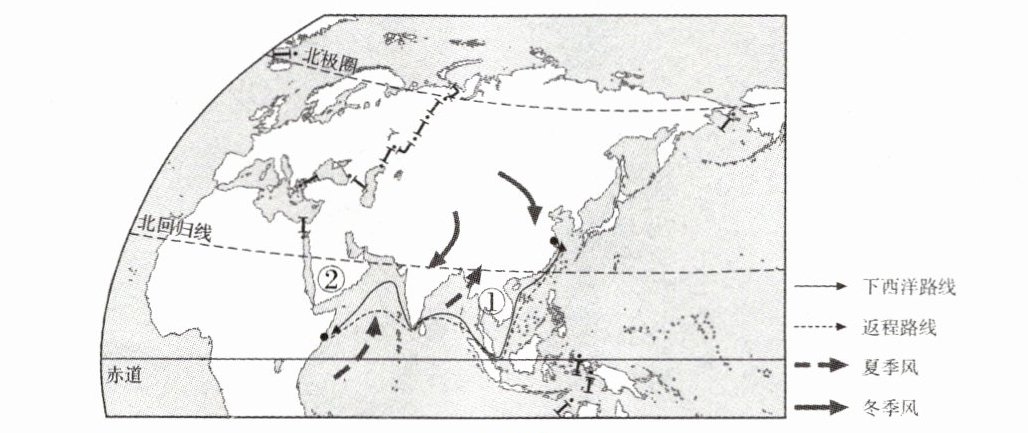 (大洋)。(2)明朝时期没有发动机,船队航行主要依靠风力驱动。郑和船队出发的季节最有可能是