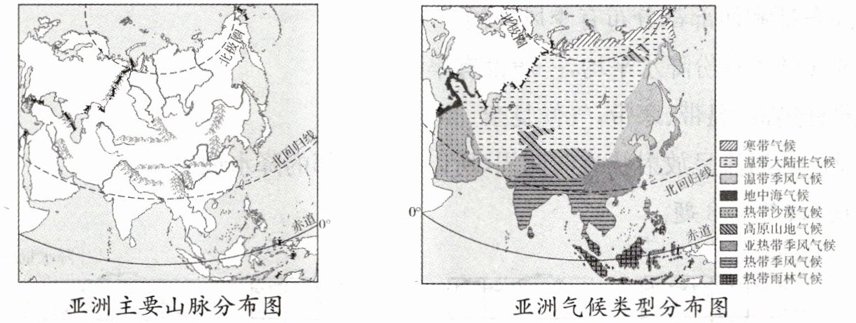 2.读亚洲主要山脉分布图和亚洲气候类型分布图,回答下列问题。