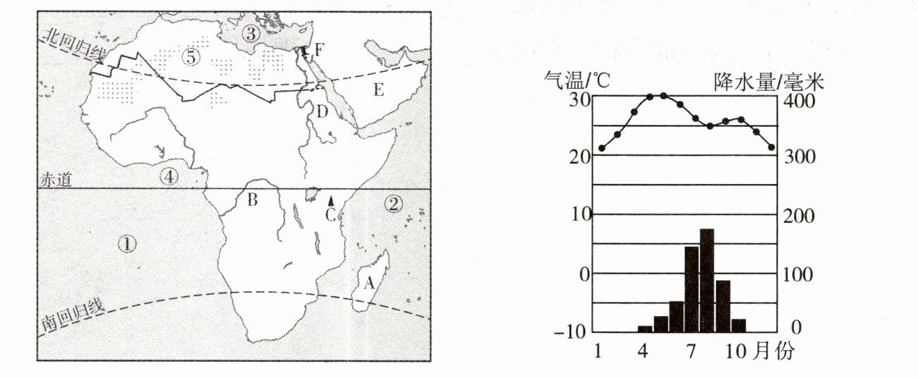 (1)填出左上图中字母和数码所代表的地理事物名称。