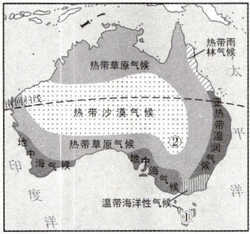 如果说澳大利亚是一本书,广袤和富饶就是它的卷首语。翻开书的扉页,树袋熊的欢呼声、牧羊人的哨子声、采矿场的轰隆声……交织成悠扬的文字,谱写出地球上美妙的交响曲。下图为澳大利亚气候类型图。